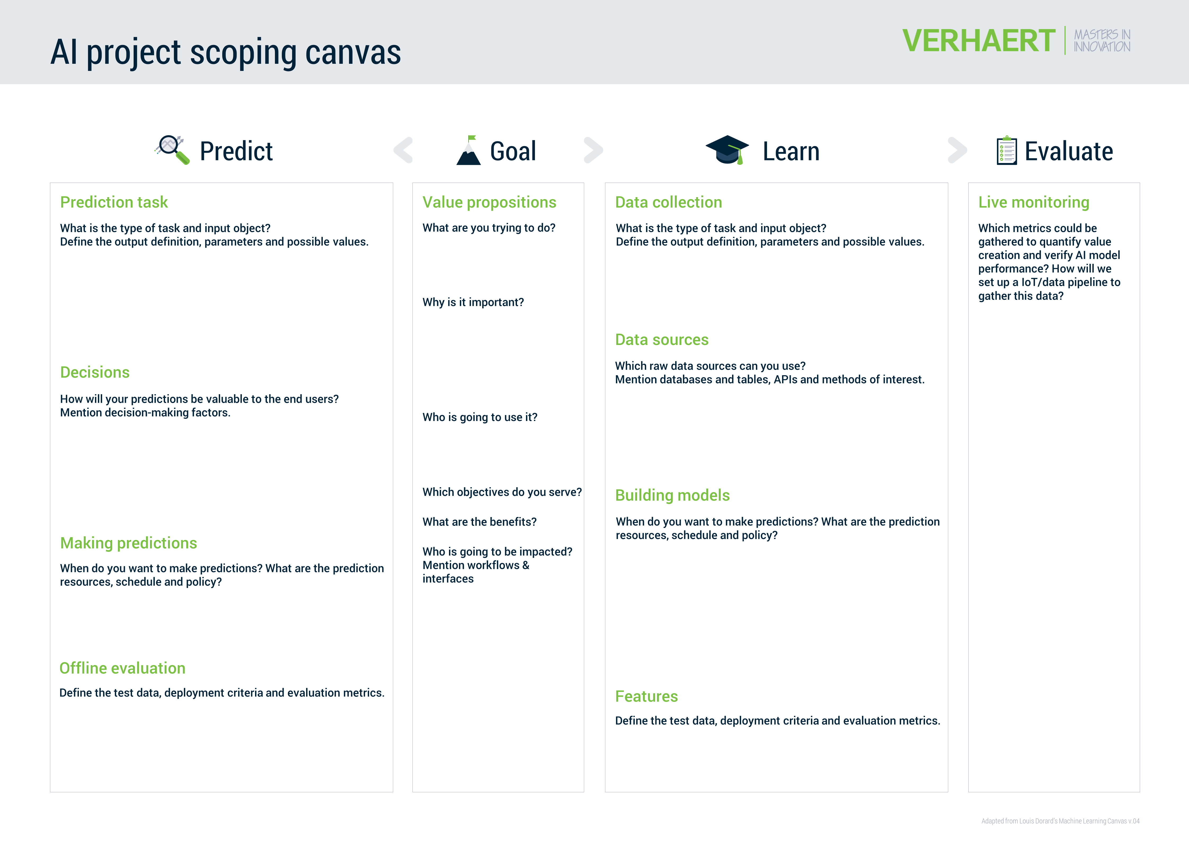 Ideally, all relevant stakeholders are represented when filling in the canvas: end-users, application domain experts, operators, process owners, product managers, data managers, marketing, and many more. Even better is when a data scientist or AI expert is also present to help guide the session. Can’t get everyone in the same room right now? No problem! This guide aims to get you started on your own. You won’t be able to fill in all of the fields, but this will show you your blind spots. At Verhaert, we can help you fill these in at any stage.